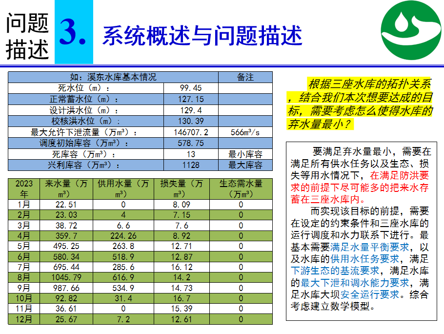 正是基于這樣的現(xiàn)實痛點,國水水務(wù)啟動汀溪水庫群優(yōu)化調(diào)度課題研究,試圖以技術(shù)創(chuàng)新打破傳統(tǒng)調(diào)度的瓶頸。交流會上,國水水務(wù)技術(shù)團隊詳細介紹了課題的核心研究思路:首先通過梳理汀溪水庫群中汀溪水庫、溪東水庫、竹壩水庫的拓撲關(guān)系與水文數(shù)據(jù),明確各水庫的功能定位與約束條件;隨后結(jié)合歷史水文數(shù)據(jù)與區(qū)域用水特征,構(gòu)建涵蓋“水文預(yù)報誤差、需水波動、發(fā)電負荷變化”的多約束模型,并引入遺傳算法進行求解,最終實現(xiàn)“在保障防洪安全的前提下,******化減少棄水、提升供水保障率與生態(tài)流量滿足度”的目標(biāo)。