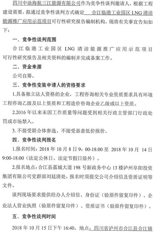 競爭性談判公告:合江臨港工業(yè)園區(qū)LNG清潔能源推廣應(yīng)用示范項目可行性研究報告編制單位競爭性談判公告