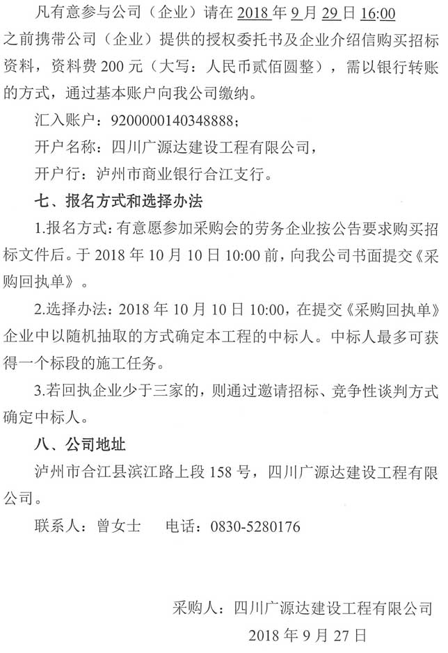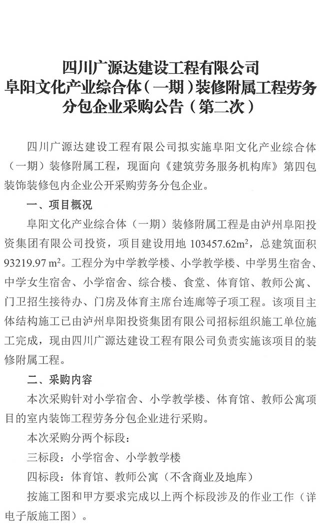 采購公告:四川廣源達建設工程有限公司阜陽文化產(chǎn)業(yè)綜合體(一期)裝修附屬工程勞務分包企業(yè)采購公告(第二次)
