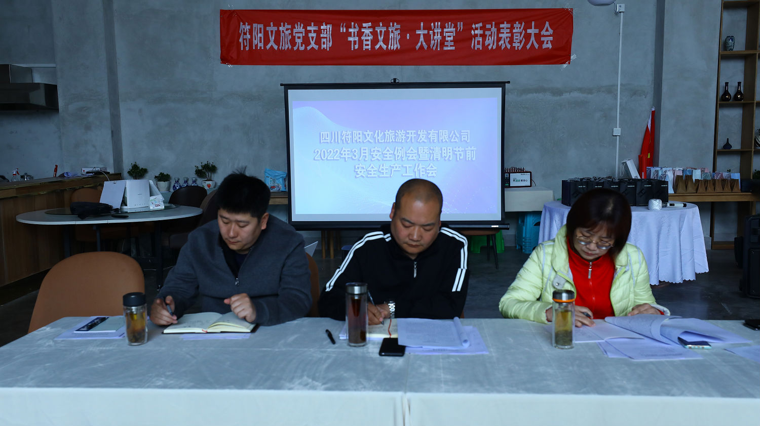 2022 年 3 月 24 日 , 符 陽 文 旅 公 司 召 開 3 月 安 全 生 產(chǎn) 工 作會(huì)。 總經(jīng)理吳平主持會(huì)議, 全體員工參加。 會(huì)上, 譙棣升 董事長(zhǎng)圍繞交通運(yùn)輸安全、 在建項(xiàng)目安全、 森林防滅火安全、 地質(zhì)災(zāi)害防范、 酒店經(jīng)營安全等幾個(gè)方面作了講話, 強(qiáng)調(diào)每 個(gè)員工都有安全責(zé)任, 發(fā)現(xiàn)違章作業(yè)要大膽制止, 保證安全 生產(chǎn)。