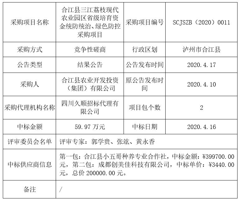 合江縣三江荔枝現(xiàn)代農(nóng)業(yè)園區(qū)省級培育資金統(tǒng)防統(tǒng)治、綠色防控采購項目競爭性磋商結果公告