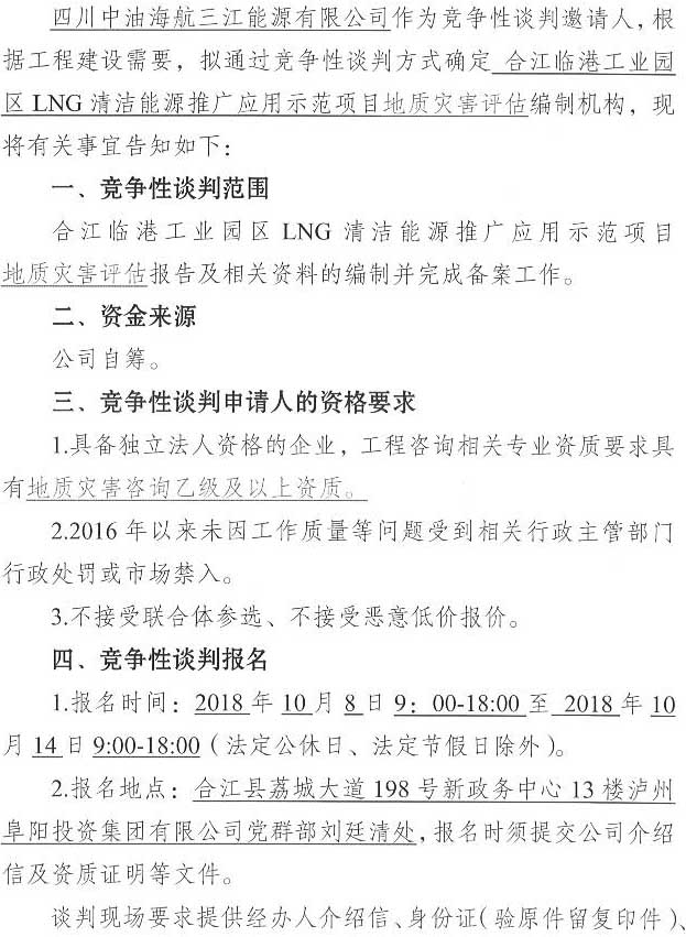 競爭性談判公告:合江臨港工業(yè)園區(qū)LNG清潔能源推廣應用示范項目地質(zhì)災害評估單位競爭性談判公告