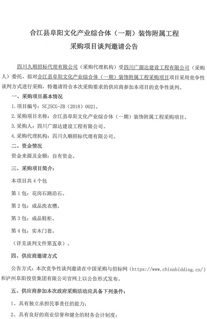 邀請公告:合江縣阜陽文化產(chǎn)業(yè)綜合體(一期)裝飾附屬工程采購項(xiàng)目談判邀請公告