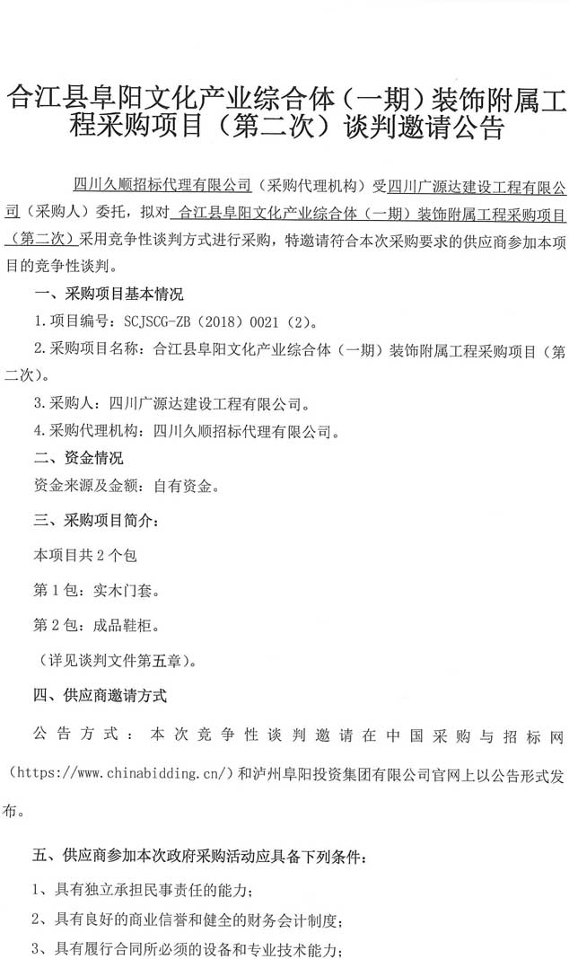 邀請公告:合江縣阜陽文化產(chǎn)業(yè)綜合體(一期)裝飾附屬工程采購項目(第二次)談判邀請公告
