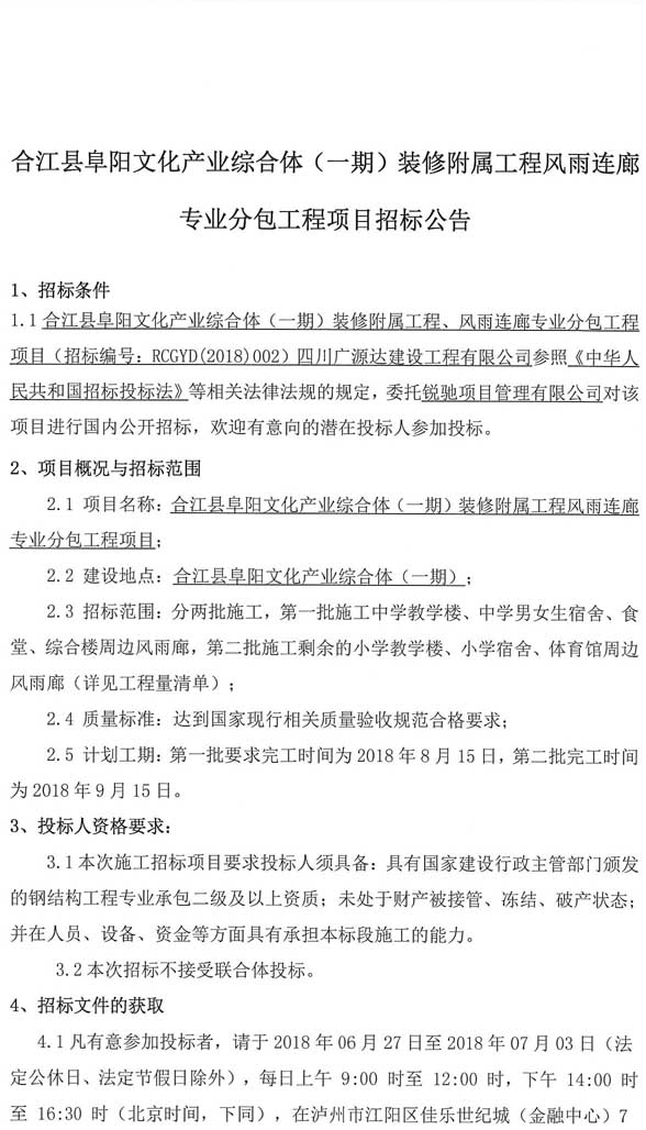 招標(biāo)公告:合江縣阜陽文化產(chǎn)業(yè)綜合體(一期)裝修附屬工程風(fēng)雨連廊專業(yè)分包工程項(xiàng)目招標(biāo)公告