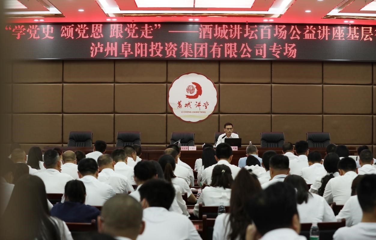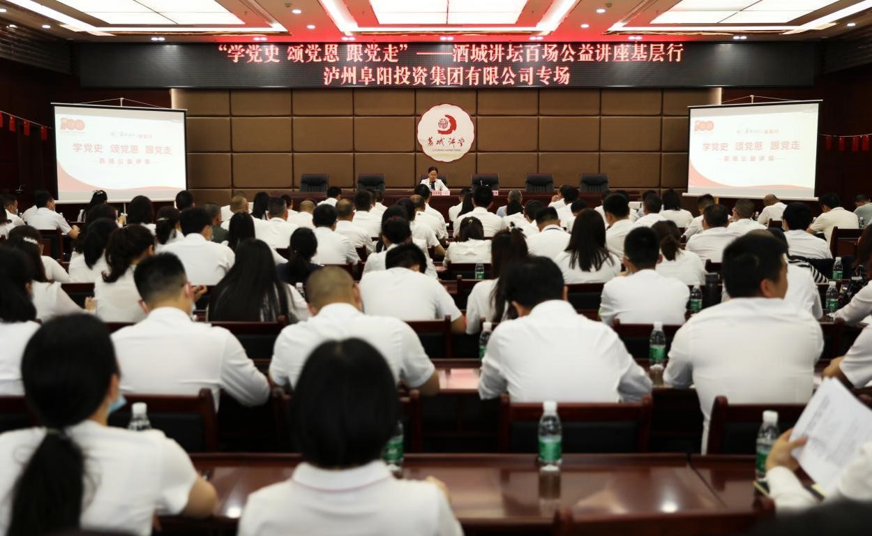 5月19日下午,“學(xué)黨史頌黨恩跟黨走”——酒城講壇百場公益講座基層行瀘州阜陽投資集團(tuán)有限公司專場在政務(wù)中心15樓會(huì)議室舉行。活動(dòng)由黨委書記、董事長游啟君主持,合江縣委宣傳部派出指導(dǎo)人員,集團(tuán)全體領(lǐng)導(dǎo)班子、本部及下屬公司職工200余人參加。