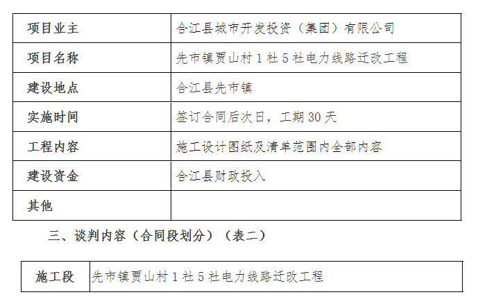 一、 本次談判項(xiàng)目為先市鎮(zhèn)賈山村 1 社 5 社電力線路遷改工程, 現(xiàn)通 過競爭性談判方式選擇和確定承包人, 誠邀符合資格條件的潛在申請 人參與本項(xiàng)目的競爭性談判。