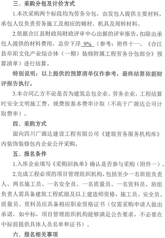 采購公告:四川廣源達建設工程有限公司阜陽文化產(chǎn)業(yè)綜合體(一期)裝修附屬工程勞務分包企業(yè)采購公告(第二次)