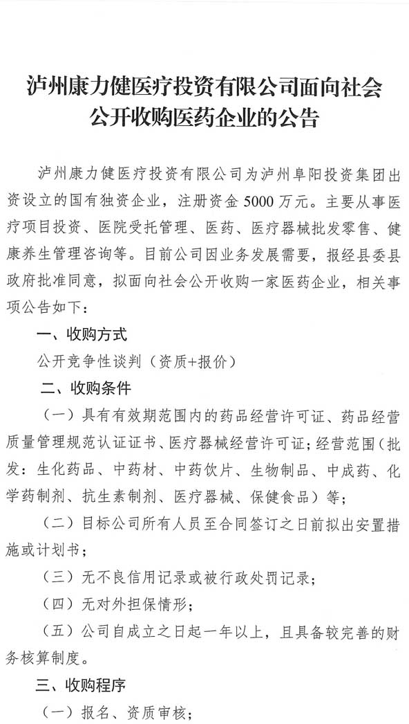 瀘州康力健醫(yī)療投資有限公司面向社會(huì)公開(kāi)收購(gòu)醫(yī)藥企業(yè)的公告.doc