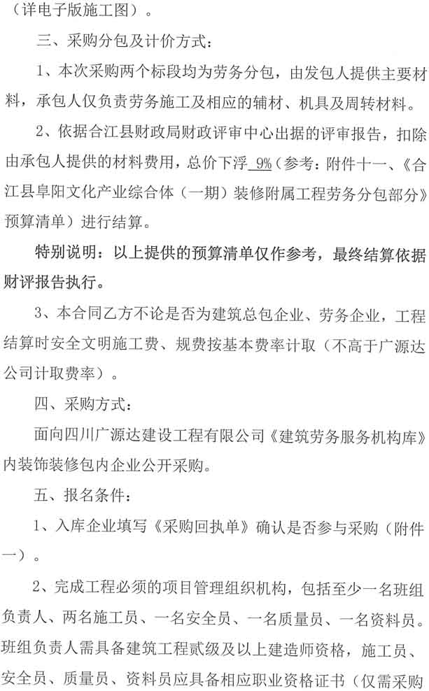 采購(gòu)公告:四川廣源達(dá)建設(shè)工程有限公司阜陽(yáng)文化產(chǎn)業(yè)綜合體(一期)裝修附屬工程勞務(wù)分包企業(yè)采購(gòu)公告