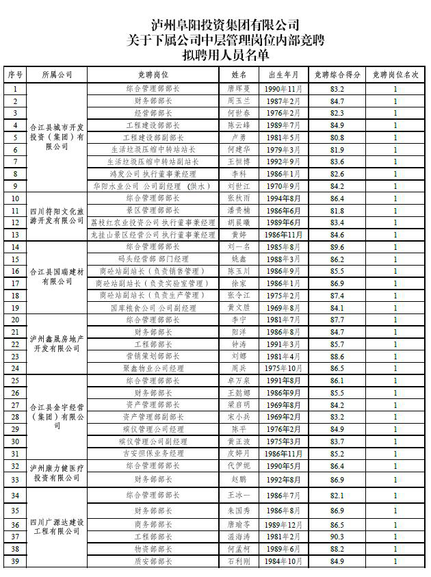 根據(jù)《瀘州阜陽投資集團(tuán)有限公司關(guān)于下屬公司中層管理崗位內(nèi)部競(jìng)聘工作的公告》(瀘阜投發(fā)〔2020〕21號(hào))的規(guī)定,經(jīng)阜陽集團(tuán)黨委會(huì)研究決定,擬聘用唐琿蔓等39人為瀘州阜陽投資集團(tuán)有限公司下屬公司中層管理人員。現(xiàn)面向社會(huì)公示7日,公示時(shí)間2020年6月19日至2020年6月25日。公示期間,如有問題,請(qǐng)及時(shí)向?yàn)o州阜陽投資集團(tuán)有限公司組織與人力資源管理部反映。要求舉報(bào)者署實(shí)名,實(shí)事求是地反映問題,并提供必要的調(diào)查線索。