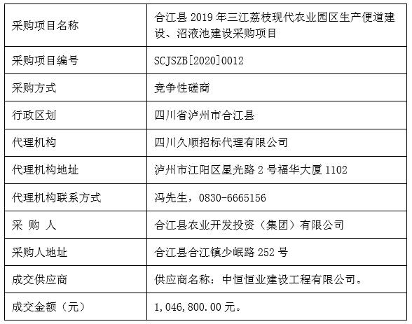 合江縣2019年三江荔枝現(xiàn)代農(nóng)業(yè)園區(qū)生產(chǎn)便道、沼液池建設(shè)采購項(xiàng)目競(jìng)爭(zhēng)性磋商成交公告