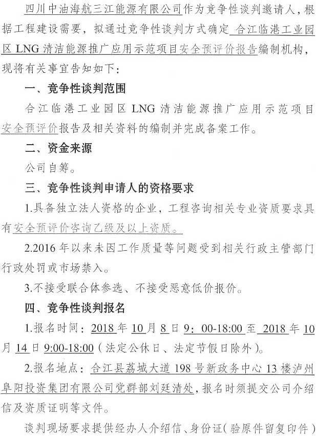 競爭性談判公告:合江臨港工業(yè)園區(qū)LNG清潔能源推廣應(yīng)用示范項目安全預(yù)評價單位競爭性談判公告